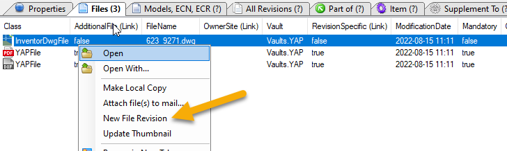 A new file revision of the file is created and a writable copy of the file is located in the work directory. Note that the object icon has changed and the attribute Revision Sequence has increased.