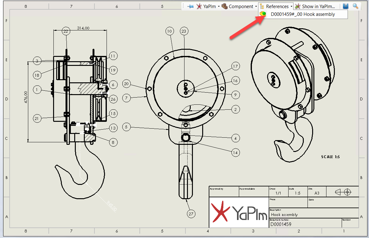 The reference functionality can be used to toggle between the active files references in YaPlm. For example if a 3D model is opened the references shows the Drawing